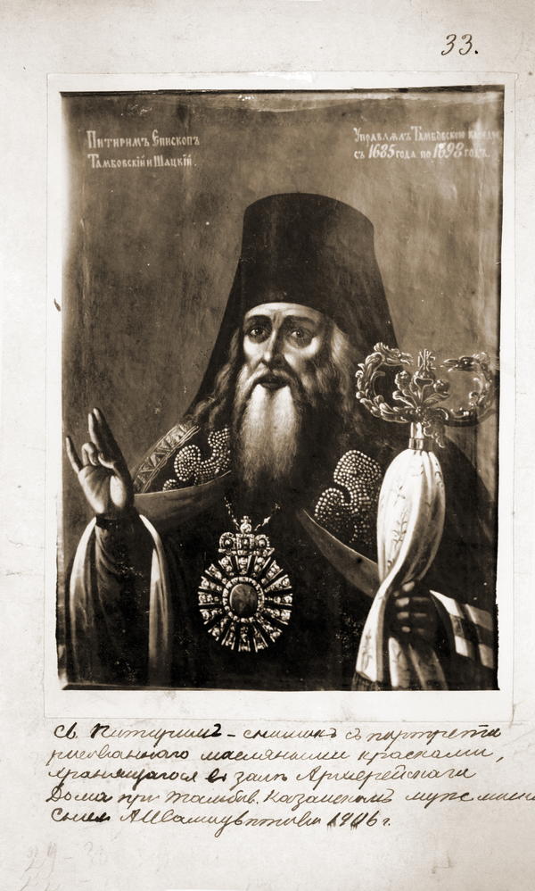 В период пребывания на Тамбовской кафедре святителя Феофана (Говорова; 1859–1863), предметом его особых забот стало изучение святой богоугодной жизни, трудов и подвигов святителя Питирима, систематизация его наследия. Именно в этот период создается рукописная книга «Описание чудес святителя Питирима, втораго епископа Тамбовского, с кратким сведением о его жизни»5.