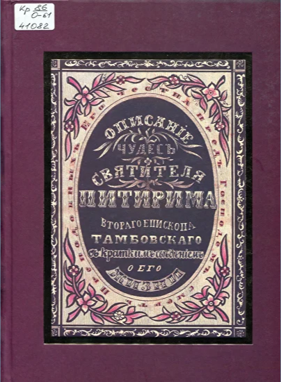 Описание чудес святителя Питирима, второго епископа Тамбовского по кратким сведениям его жизни. - Тамбов : Тамбовская типография "Пролетарский светоч", 2014. - 310 с. - ISBN 978-5-98429-189-7. - Текст : непосредственный.